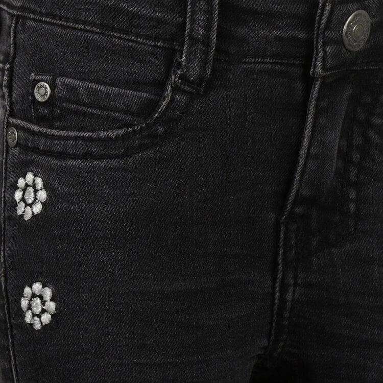 Go for a stylish look with these black Koko Noko flared jeans! The cool wash and embroidered flowers give these trousers a playful and contemporary look. The wide legs ensure a trendy fit, while the adjustable waist guarantees a perfect fit. Handy: the black jeans have an adjustable waist and sizes up to 110 have a slide button, making them extra easy to put on and take off. Combine these girls' jeans with a blouse or jumper for an outfit that always looks great.