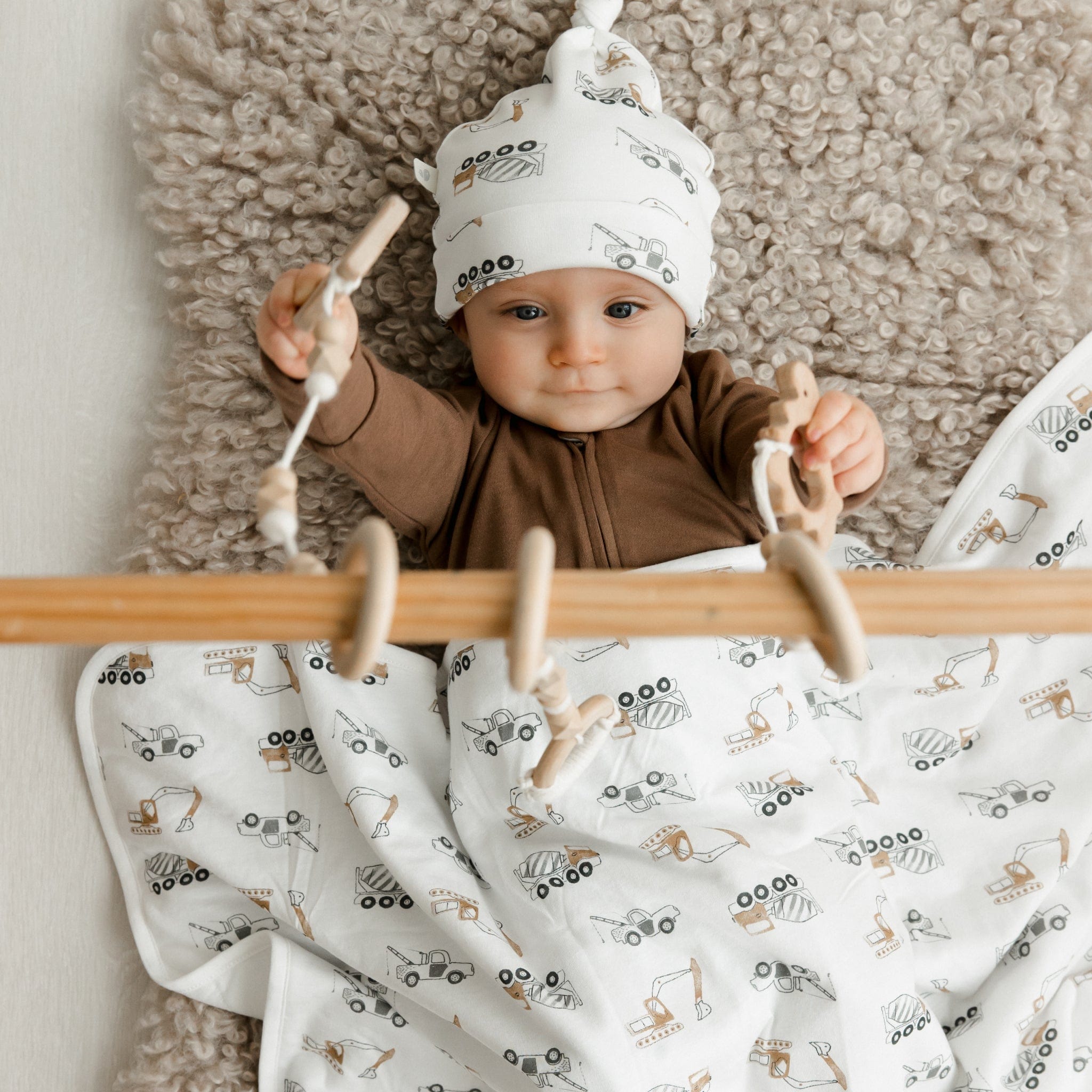 Wrap your little one in the comforting embrace of our ultra-soft bamboo baby blanket, designed with a playful construction motif featuring trucks and diggers. This bamboo-cotton blend offers a naturally silky texture, ensuring gentle warmth and breathability for your baby's sensitive skin. Perfect for naps, stroller rides, or bedtime, this blanket's delightful pattern sparks imagination while providing year-round coziness. Crafted with care in Canada, it's an essential addition to any nursery, combining safety and style effortlessly.